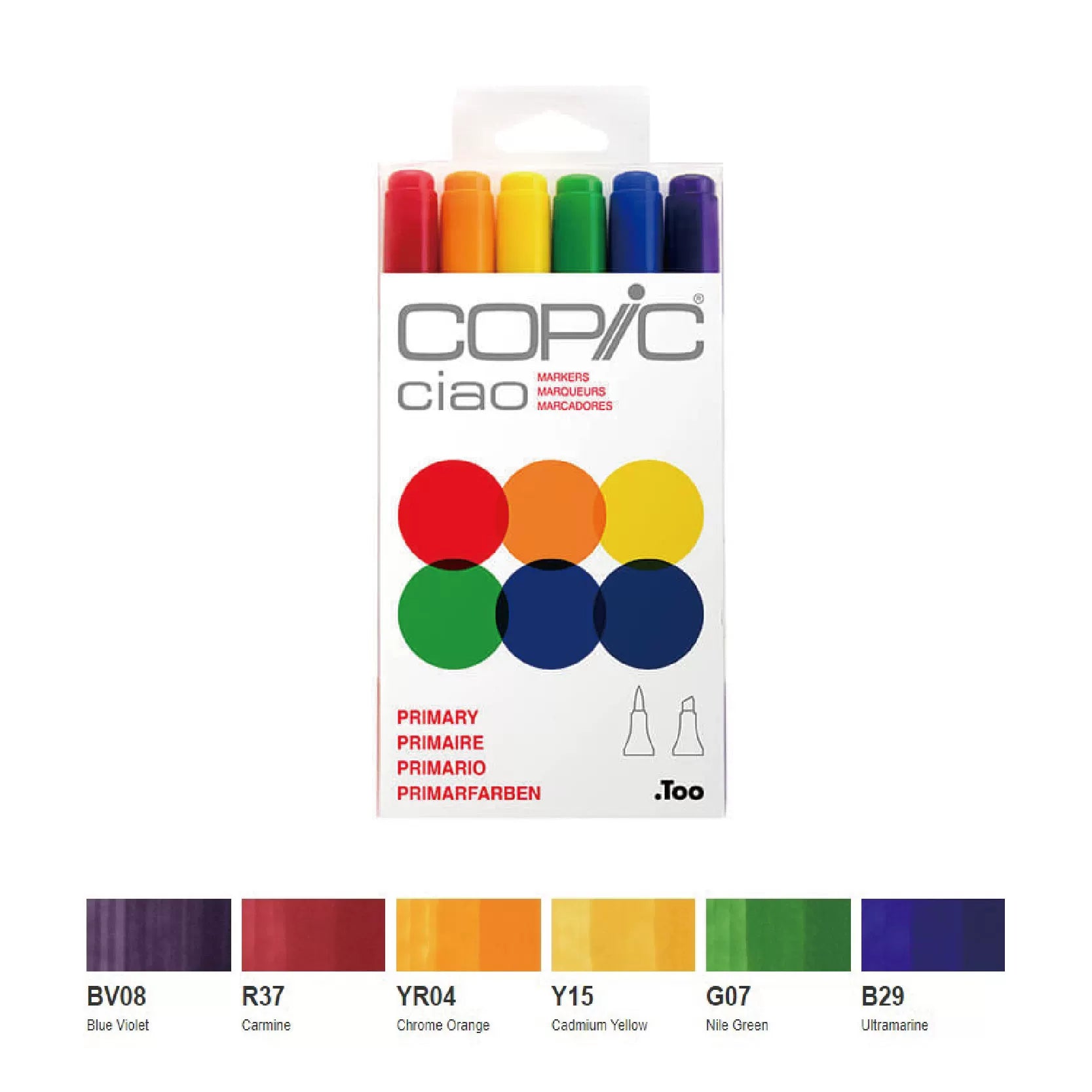 Sada COPIC Ciao Primary 6PC obsahuje tmavé, výrazné základní a doplňkové barvy, což z ní činí skvělou začátečnickou sadu pro experimentování s barvami v umění a designu.