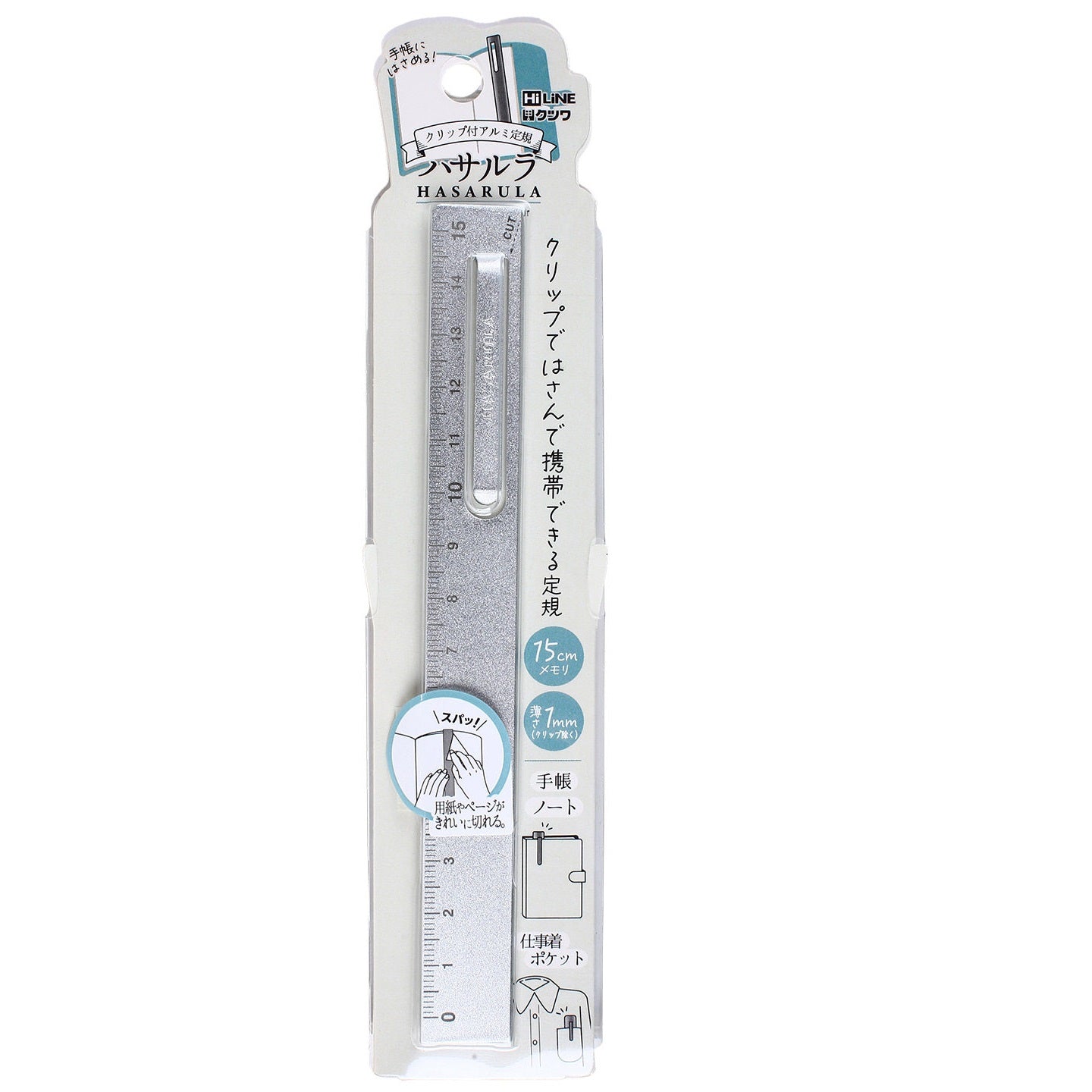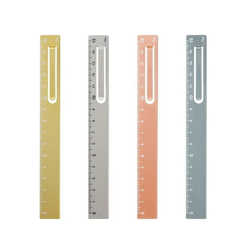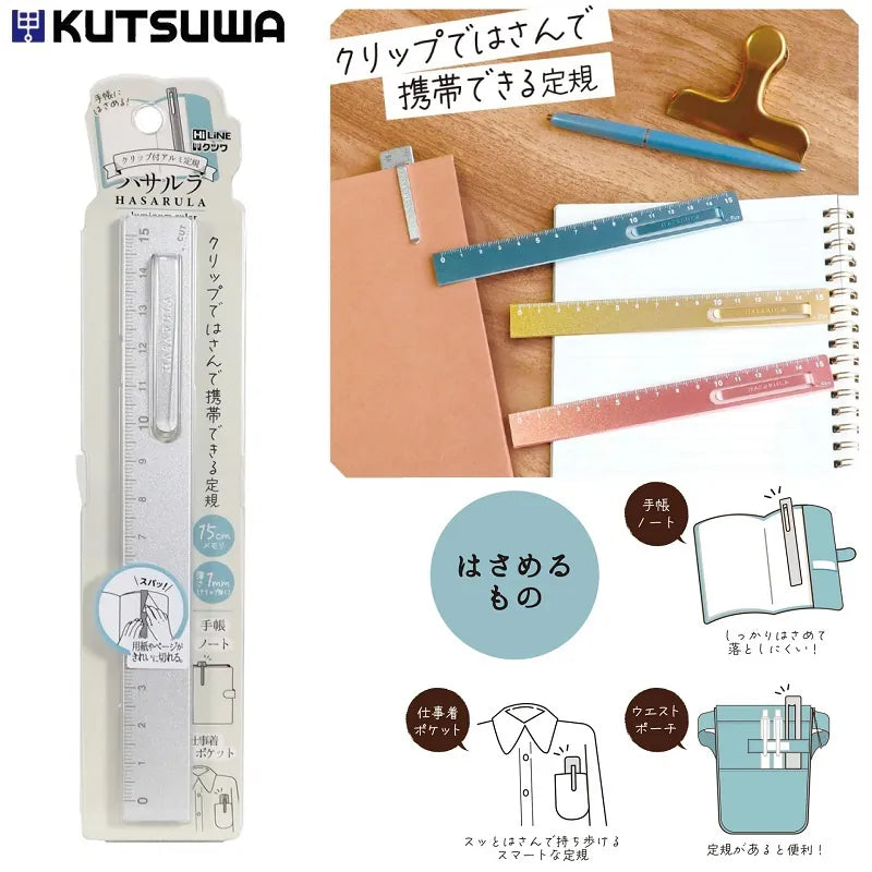 Kovová pravítko Kutsuwa Hasarula z hliníku - 15 cm s klipem a řezačem papíru