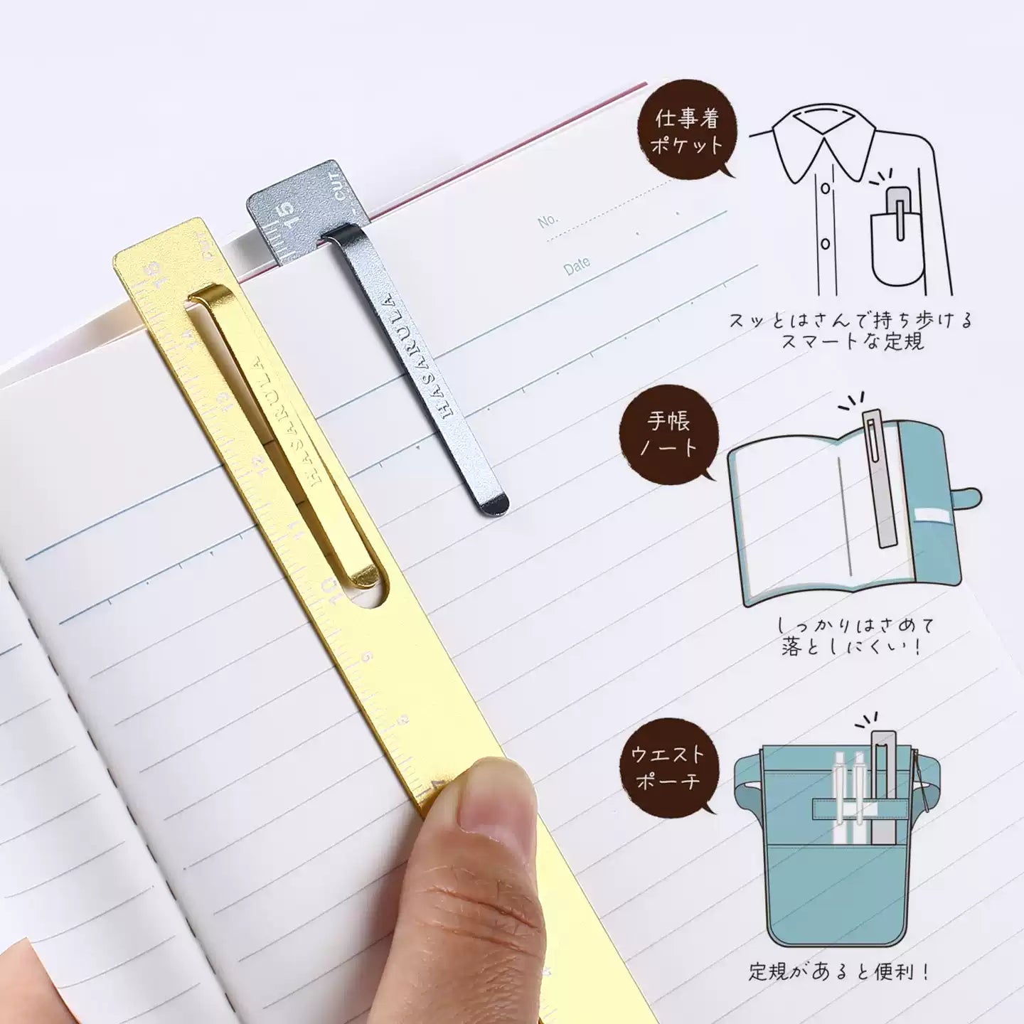 Hliníkové pravítko s klipem pro připevnění na stránky vašich knih nebo sešitů, nebo dokonce do kapsy košile či pouzdra na tužky.