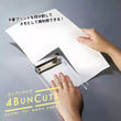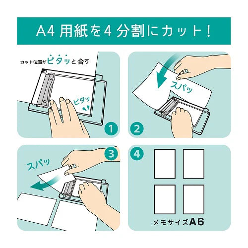 Bez nůžek, řezačky nebo skládání. Stačí položit řezač na list A4 a posunout ho po papíru, aby se čistě rozdělil na čtyři stejné části – ideální pro seznamy úkolů, rychlé poznámky a telefonní vzkazy.