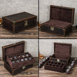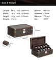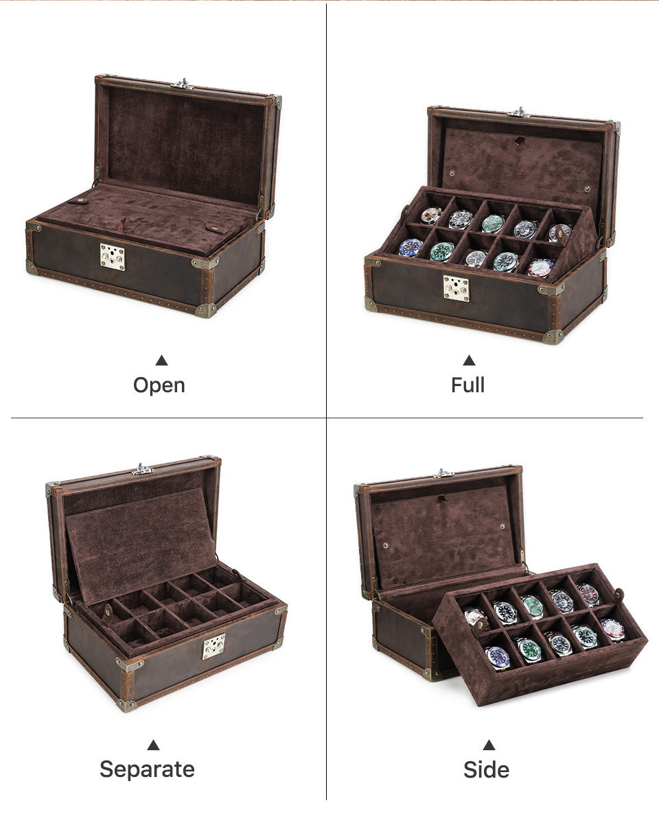 Diese handgefertigte Uhrenbox aus Holz verbindet nahtlos traditionelle Handwerkskunst mit moderner Funktionalität und ist exklusiv für Luxusuhren konzipiert. Das Äußere besteht aus einem robusten, aber eleganten Crazy Horse Leder umwickelten Holzkasten, akzentuiert mit antiken Metallnieten und achteckigen verstärkten Ecken für Stoßfestigkeit. Im Inneren sorgen samtige Fächer mit abnehmbaren Memory-Schaum-Kissen für sicheren Halt der Uhren, während ein innovatives Feuchtigkeitskontrollsystem vor Oxidation schützt. Perfekt für die Präsentation zu Hause, Geschäftsreisen oder als anspruchsvolles Geschenk.