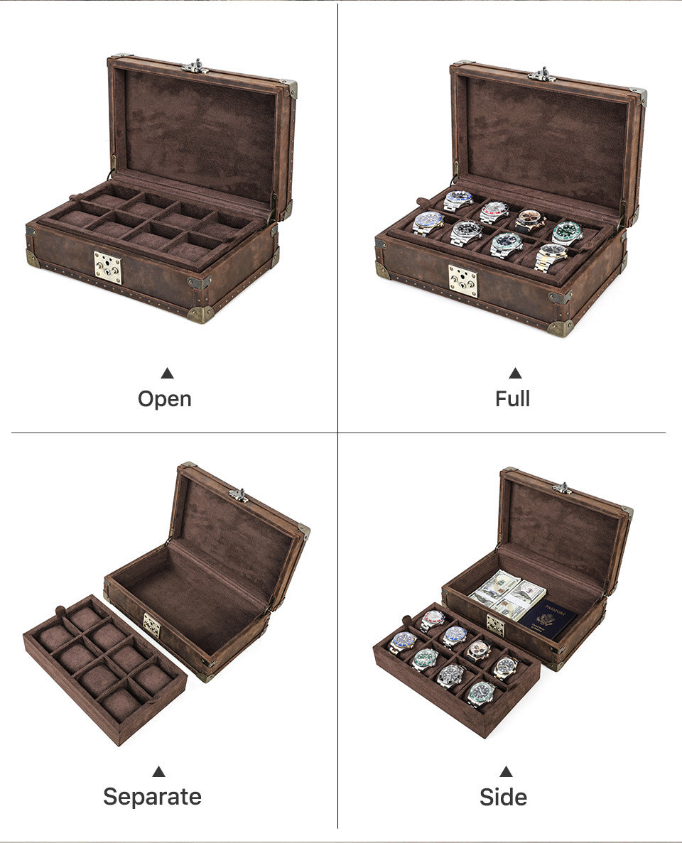 Diese handgefertigte Holz-Uhrenbox verbindet nahtlos traditionelle Handwerkskunst mit moderner Funktionalität und ist exklusiv für Luxuszeitmesser entworfen. Das Äußere besteht aus einem robusten, aber eleganten Holzgehäuse, das mit Crazy Horse Leder umwickelt ist, akzentuiert durch antike Metallnieten und achteckige verstärkte Ecken für Stoßfestigkeit. Innen sorgen samtweiche Fächer mit abnehmbaren Memory-Schaum-Kissen für sicheren Halt der Uhren, während ein innovatives Feuchtigkeitskontrollsystem vor Oxidation schützt. Perfekt für die Heimpräsentation, Geschäftsreisen oder als anspruchsvolles Geschenk.