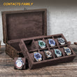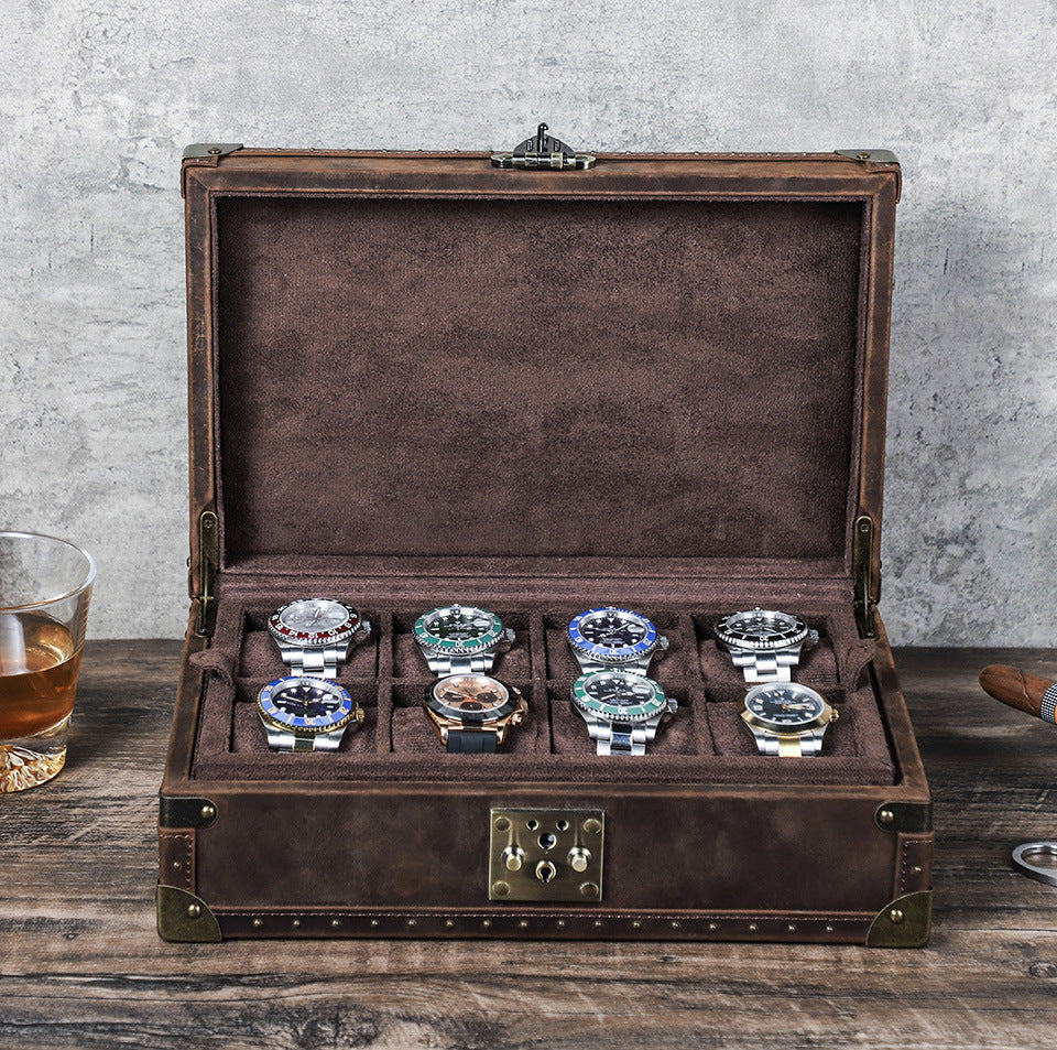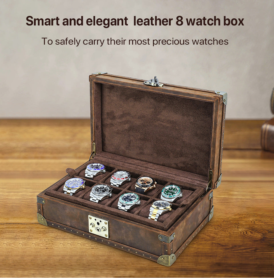 Luxuriöse handgefertigte 8-teilige Uhrenbox – Echtes Crazy Horse Leder Holz-Displaygehäuse mit abnehmbaren Kissen, metallverstärkten Kanten & Schlossverschluss für Reiseaufbewahrung und Sammlung