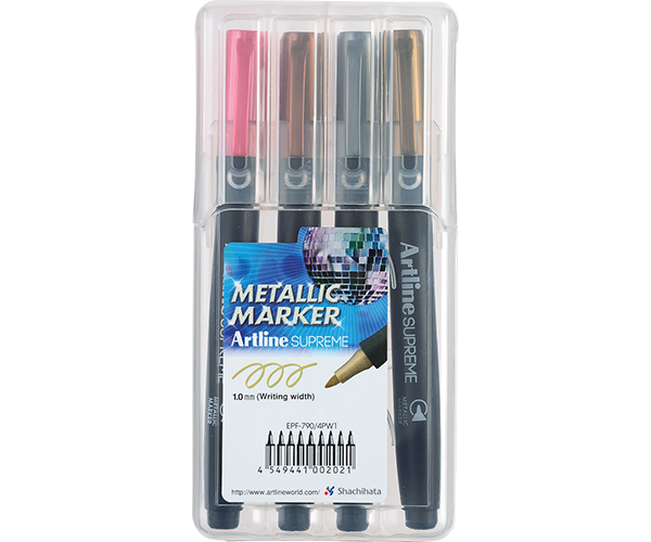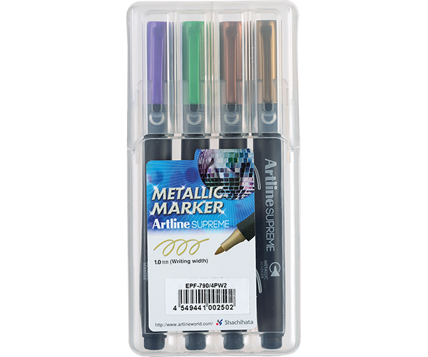 Los marcadores metálicos Artline SUPREME [EPF-790] de punta bala de 1.0 mm son ideales para artes y manualidades, incluyendo decoración y rotulación en vidrio, porcelana, plástico, metal, goma, madera y cartulina. Los pigmentos ricos en oro y plata crean un excelente efecto metálico. La tinta de secado rápido, resistente al agua y a la decoloración es completamente opaca, incluso en superficies oscuras o transparentes. El color metálico vívido permanecerá nítido y definido durante mucho tiempo. Tinta libre de ácido, certificada AP.