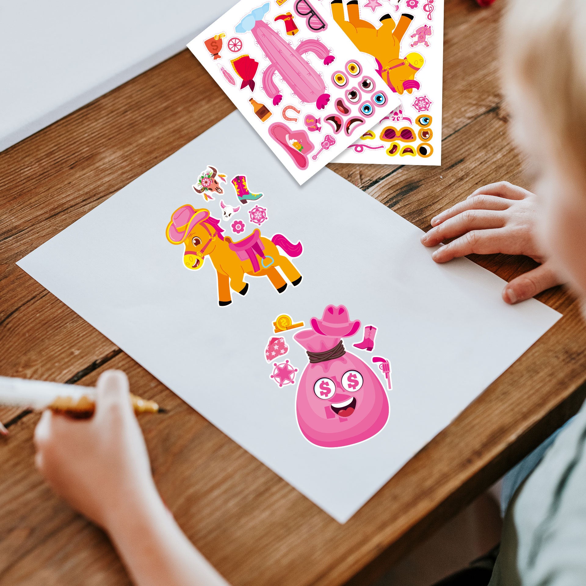 24 arkkia sarjakuvamaisia vaaleanpunaisia cowboy-tarroja lapsille, tee-se-itse -tarrat kasvojen tekemiseen pojille ja tytöille, tee omat DIY-tarrasi, taide- ja askartelupalkintoja syntymäpäiväjuhliin