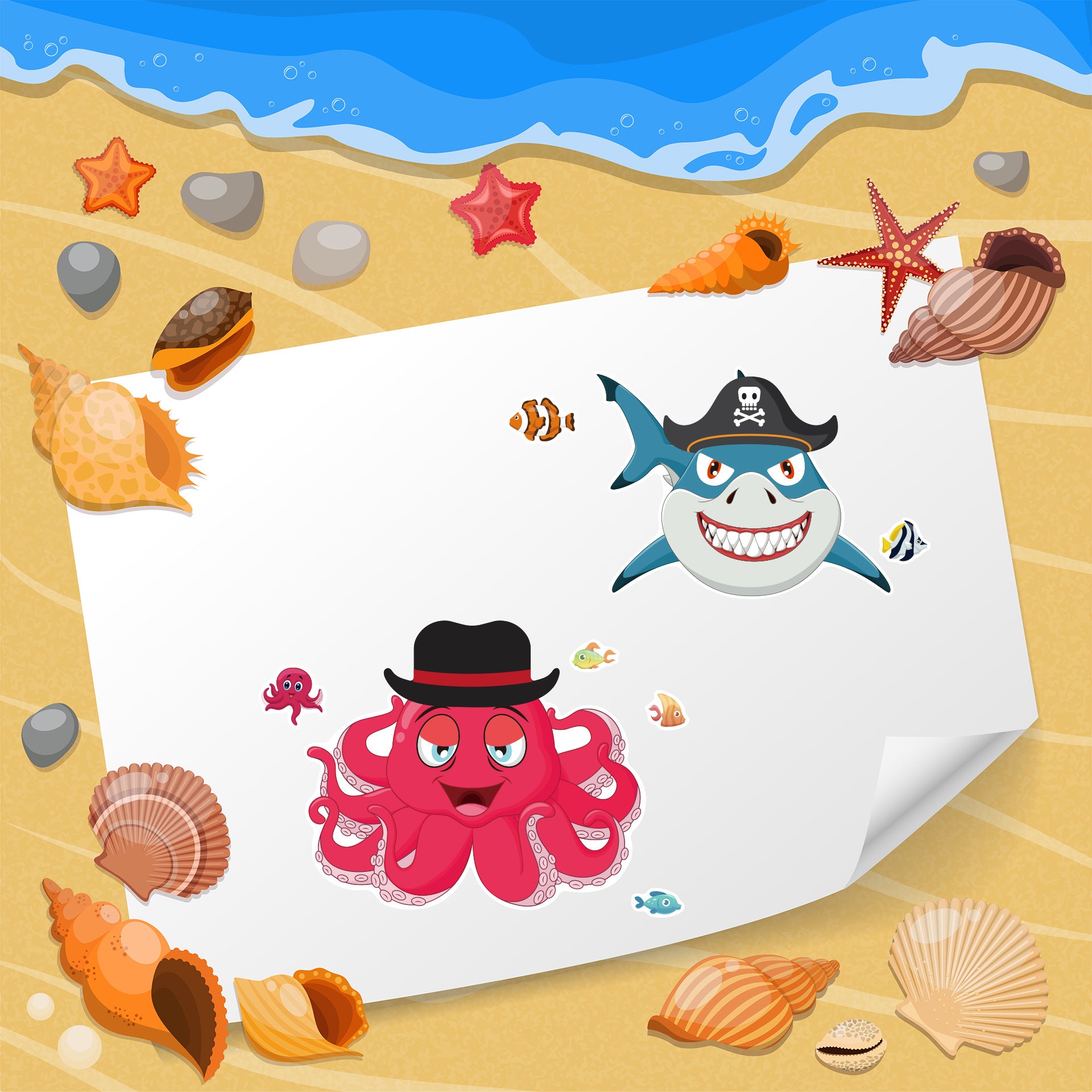 24 arkkia sarjakuvamaisia merieläinten tee-se-itse-tarroja lapsille, kasvotarroja pojille ja tytöille, tee omat tee-se-itse-tarrasi, taide- ja askartelupalkintoja syntymäpäiväjuhliin