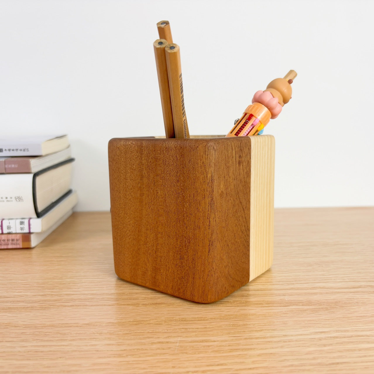 Set da 2 portapenne da scrivania quadrati con design e finitura in legno naturale a venatura