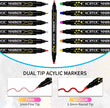 Dual-Tip acrylverfmarkers - Elke acrylpen heeft twee soorten punten: een fijne punt van 1 mm en een ronde punt van 1-5 mm. Fijne punt van 1 mm voor omlijningen en fijn lijnwerk, ronde punt van 1-5 mm voor kleuren en schilderen op grote oppervlakken.