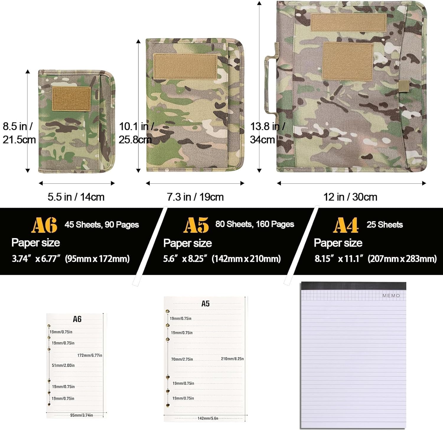 A5 Size Padfolio Ring Binder with 80 Sheets 160 Pages of Loose-Leaf Paper, Weatherproof Notebook Cover, Tactical Notebook with Zippered for Folders, Cards Refillable 6-Ring Notepad(7.3"x10.1")