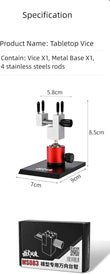 Detachable clamp with 4 adjustable Stainless steel round rods with silicone protetive sleeves, This Tabletop Vice with 10 alternative holes which perfectly for clamping irregular small and tiny parts. The spherical rotating columns can rotate 360° with a fixable and stable metal base.