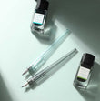 To prepare the nib, dip the nib in water, then wipe it clean. Submerge the nib in your ink of choice up until the engraved wavy line. When you want to switch colors, clean the nib with water and wipe it completely dry.