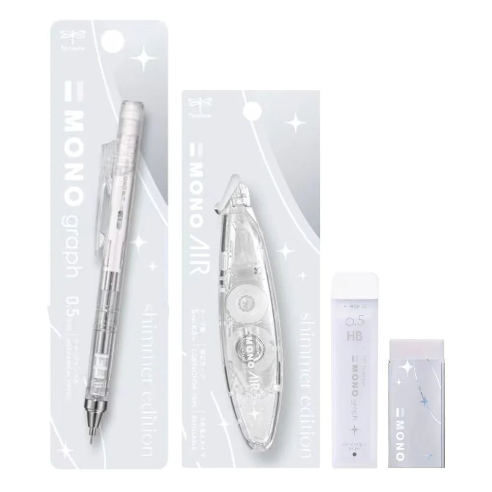 The Tombow MONO Shimmer Edition Set brings together four coordinated stationery essentials in the limited Frost shimmer color: a correction tape, mechanical pencil, pencil leads, and eraser. Each item features a bright, transparent-inspired finish with subtle sparkle.