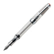 TWSBI Vac Mini Fountain Pen. Clear-barrelled vacuum-filling fountain pen. Transparent grip section and plunger cap. Chromed metal trim with matt metal pocket clip. TWSBI logo finishes the top of the cap nicely.