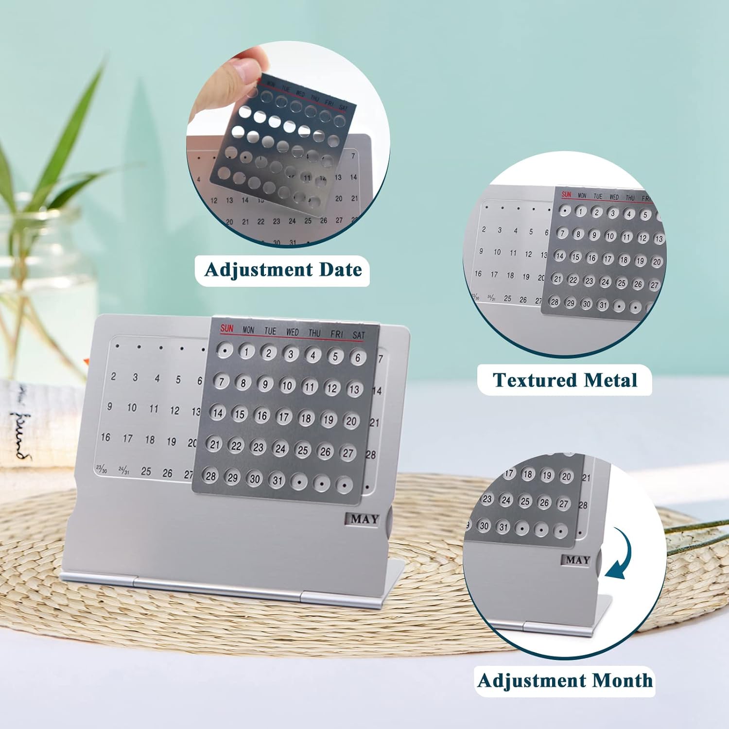 【EASY TO USE】The date and month of the unique perpetual calendar can be adjusted manually. You just scroll the circle to determine the month and move the date plate to determine the day. The blank space below can be used for sticky notes, memos, etc.