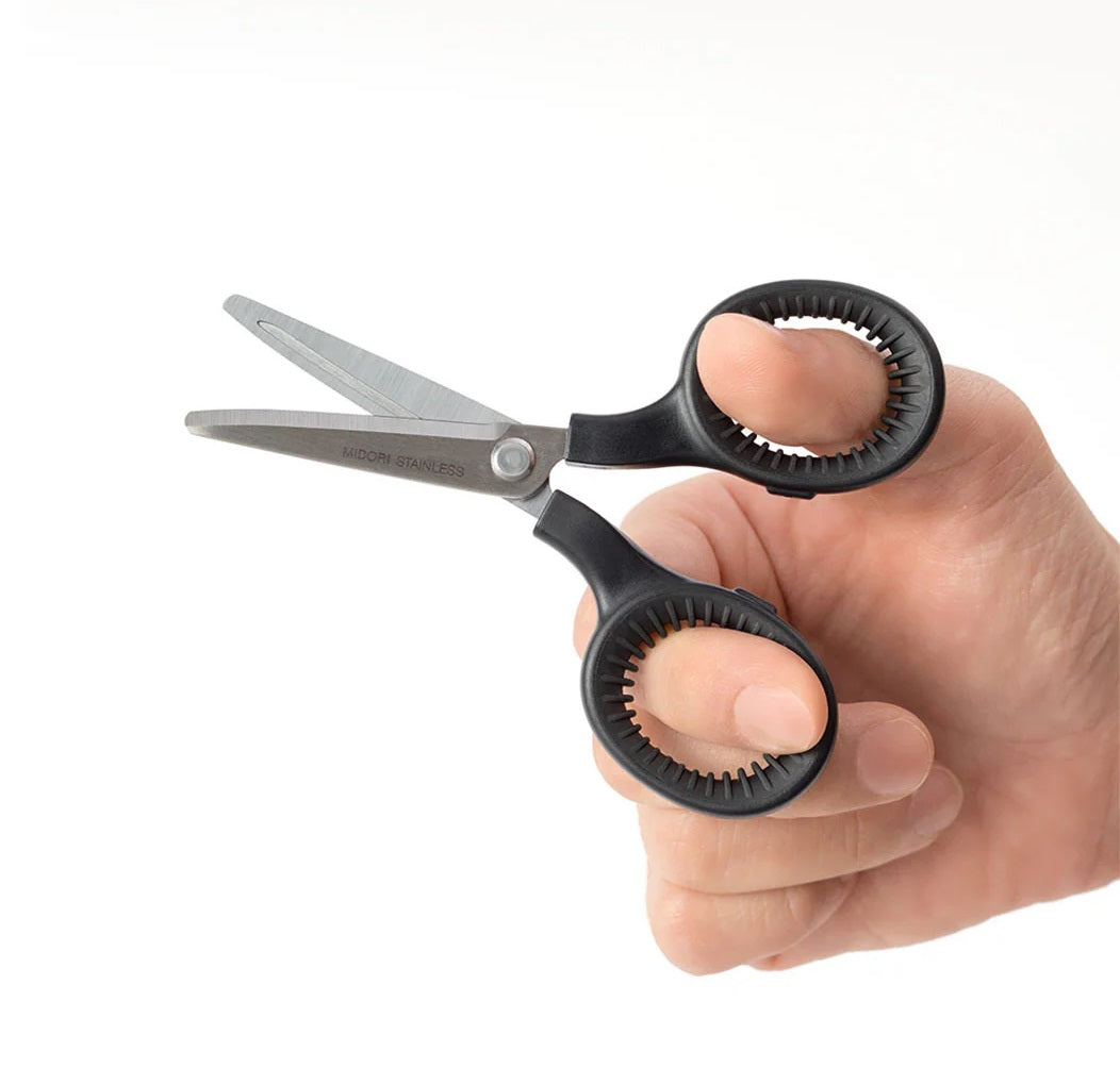Esta tesoura mini compacta e de alta qualidade da Midori tem o tamanho perfeito para levar consigo em qualquer lugar. Com a funcionalidade em mente, o cabo é estriado no interior para garantir uma pega firme e evitar escorregamentos. Cada par vem com uma capa protetora para a lâmina, facilitando o transporte na sua mala ou o armazenamento numa gaveta de escritório.