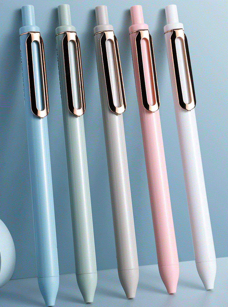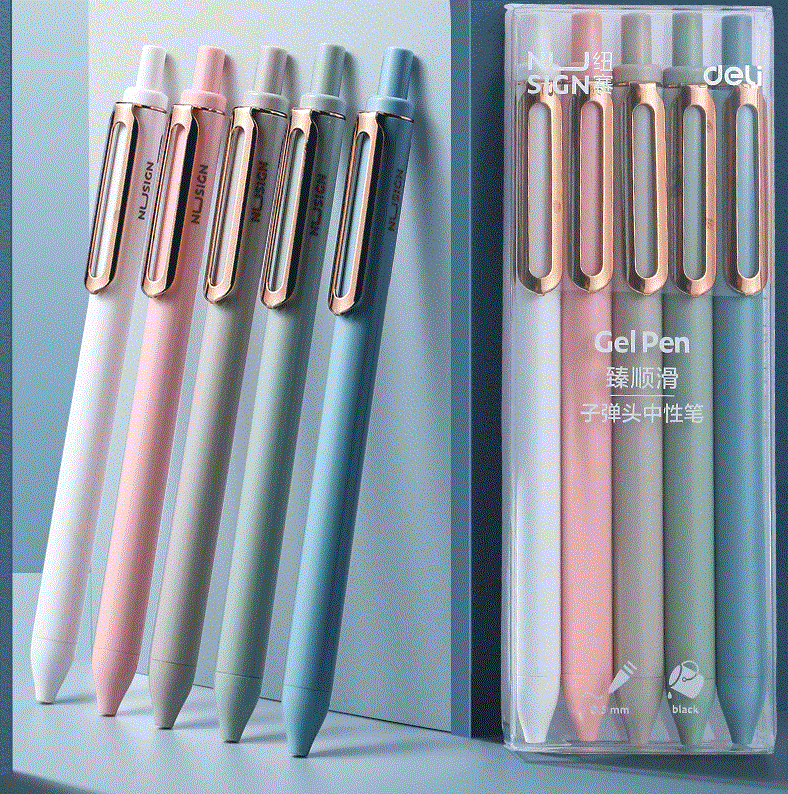 DELI NUSIGN NS572- Pixuri gel retractabile, pachet de 5, cerneală neagră, vârf fin 0,5 mm, corpuri în culori Morandi cu cleme aurii, uscare rapidă, pixuri estetice pentru jurnalizare