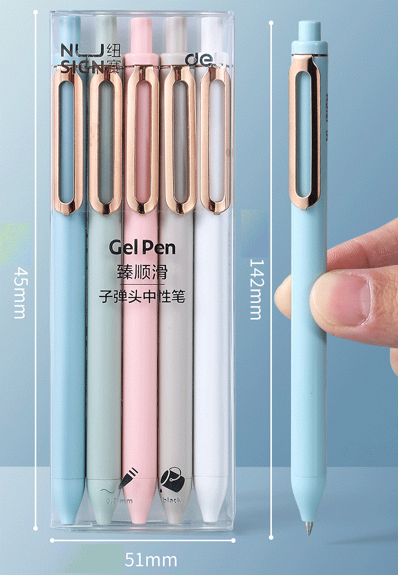 Pixurile gel retractabile DELI NUSIGN vin în pachet de 5, fiecare având un vârf de 0,5 mm pentru scris fin și cursiv.
