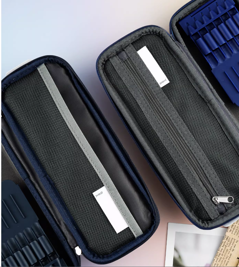 Kompakten, a prostoren etui za svinčnike z zadrgo.