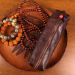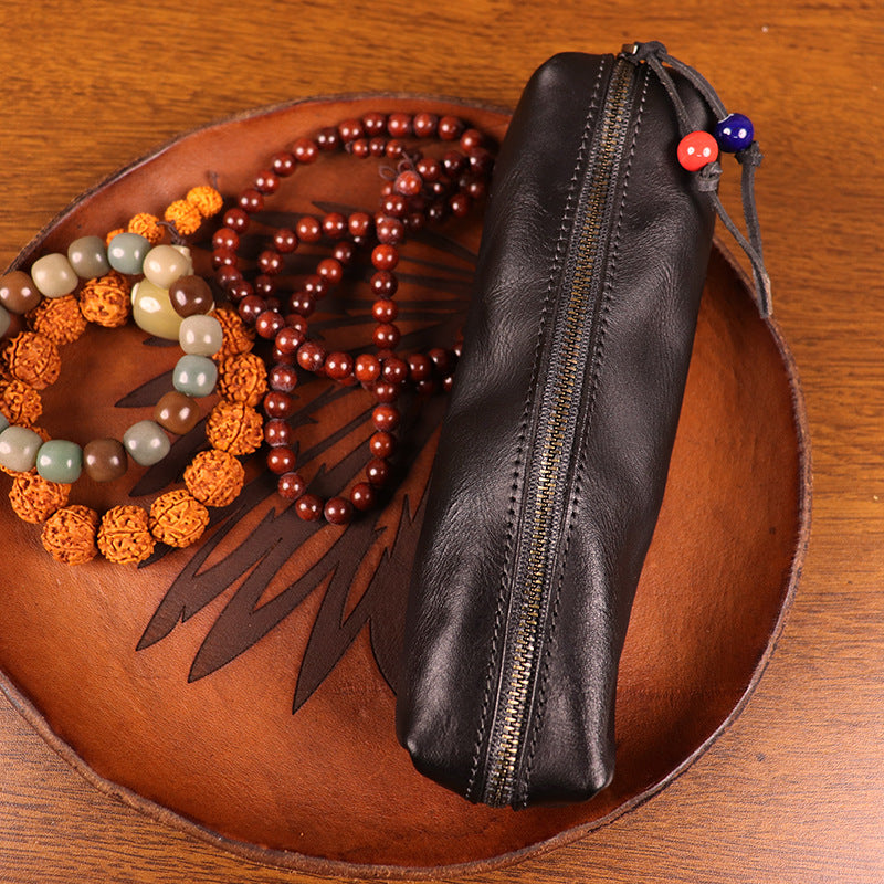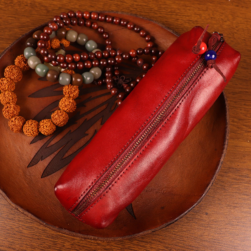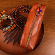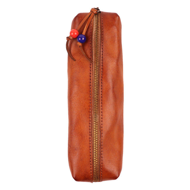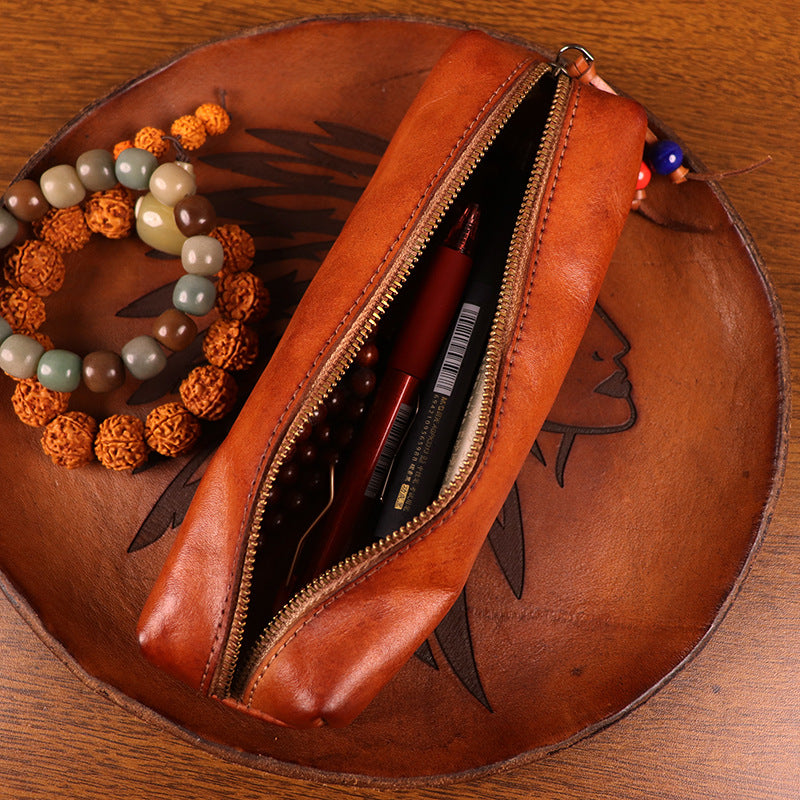 Handgjord dragkedjepåse i vegetabiliskt garvat läder – vintage sliten finish, stor förvaringskapacitet och fodral för glasögon