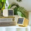 En modern gungbräda-stil väckarklocka med stor LED-display, omgivande nattljus och inbyggd temperatur- och fuktighetsövervakning.