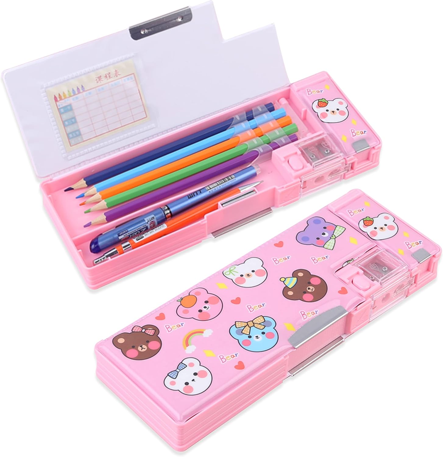 Pop Up Multifunktionellt Pennfodral för Flickor och Pojkar, Söt Tecknad Penna Box Organisatör för Skrivmaterial med Vässare, Schema, Skolmaterial, Bästa Födelsedagspresenter för Barn【Pink-Bear】