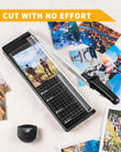 【Noggrann tung pappersskärare】Designad för precision. Formgjuten justeringsraster som aldrig bleknar och säkerställer exakta mått. Dubbel skala linjal, med markeringar i tum och centimeter.